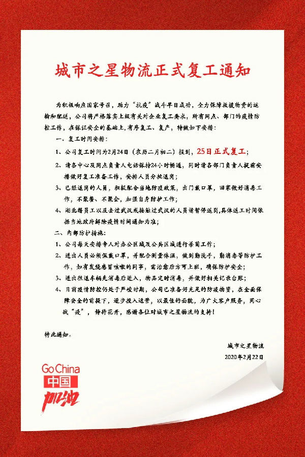 城市之星物流2020年2月25日正式復(fù)工 發(fā)布時(shí)間:2020-02-25 復(fù)工咨詢熱線400-1188 666客服中心:186-7587 0558網(wǎng)管中心:186-7587 0605